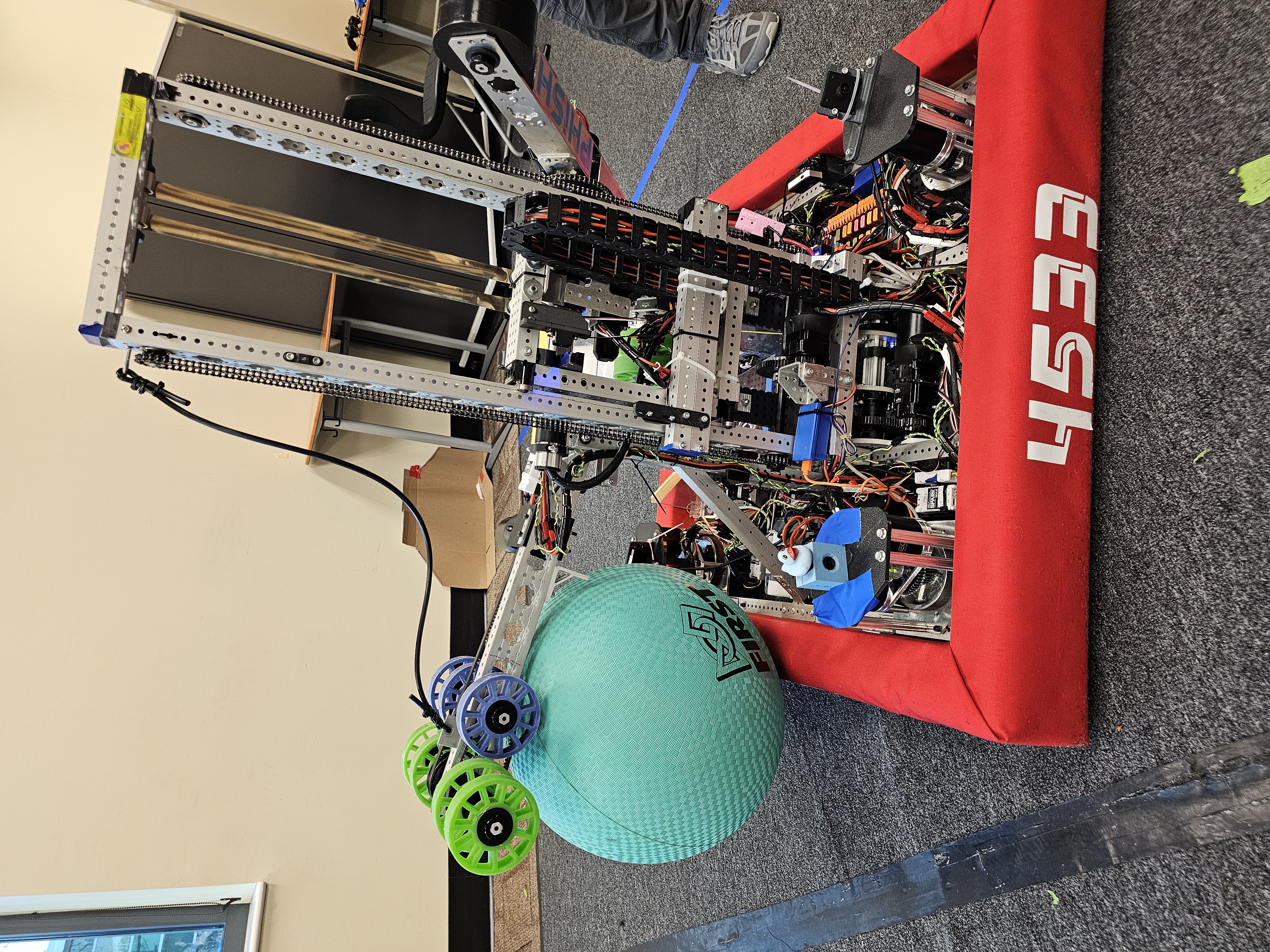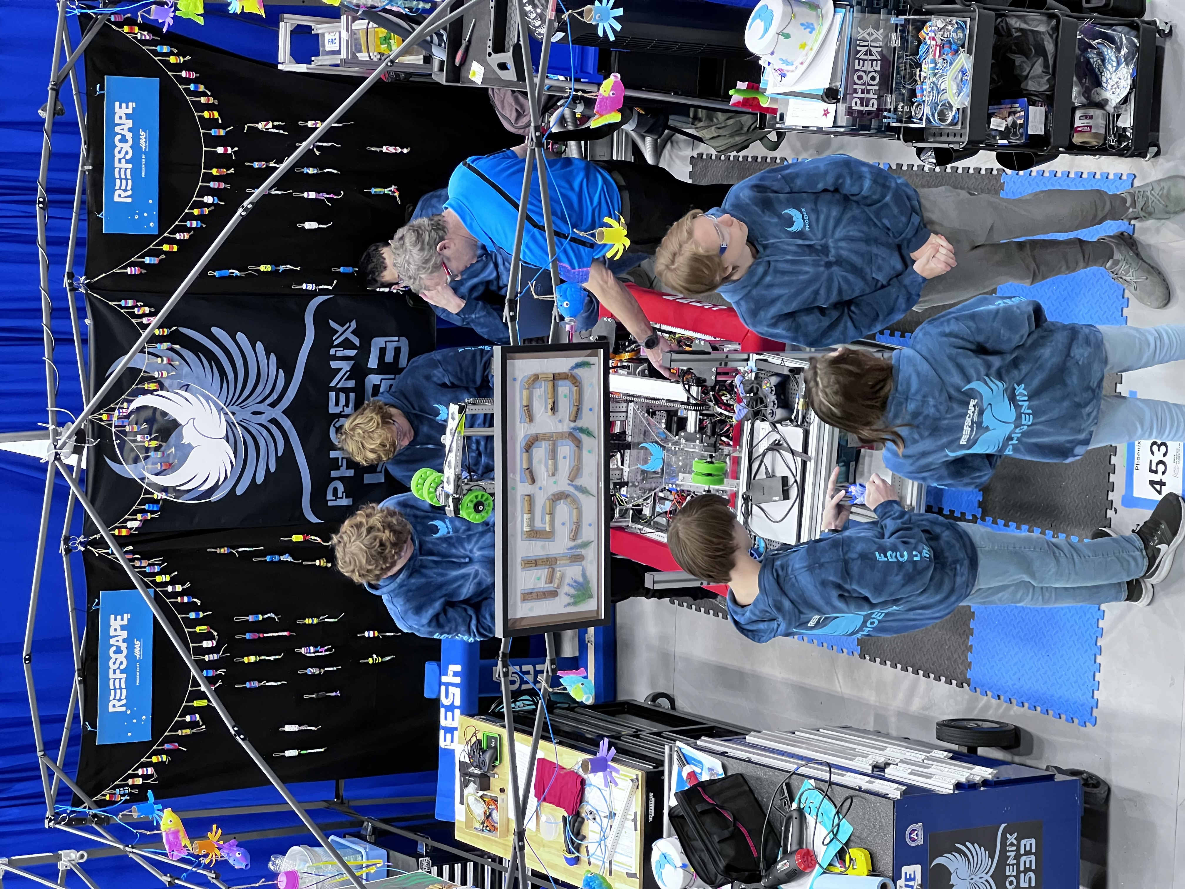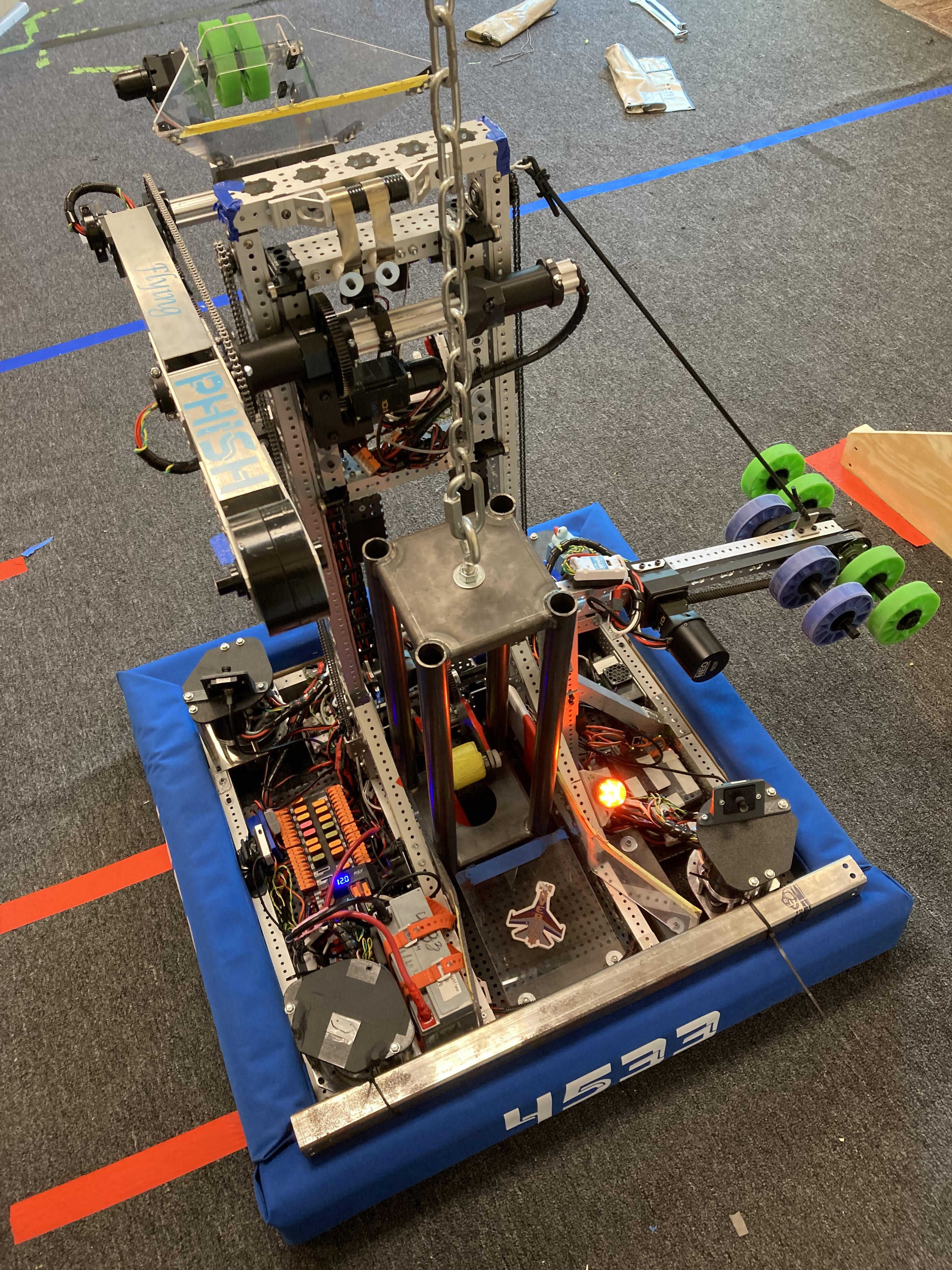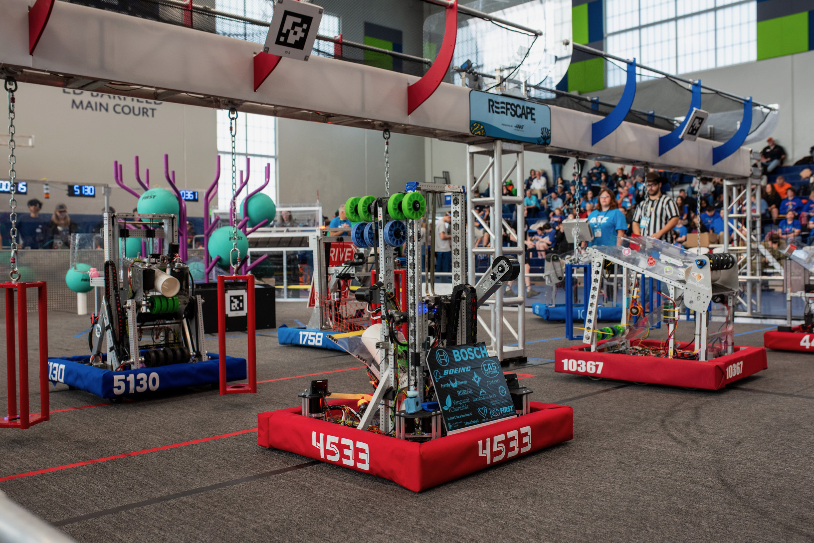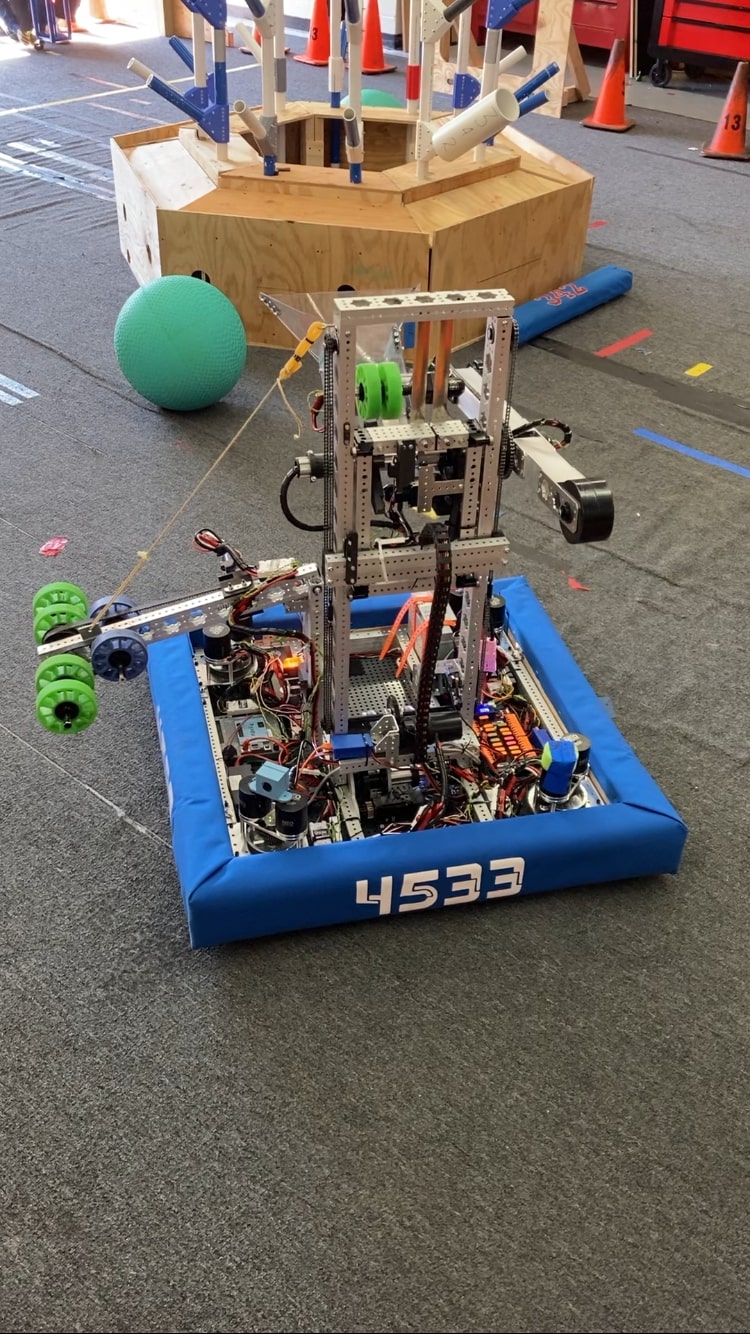 This season required us to pick up large PVC pipes (called coral) and large green playground balls (called algea). We had to place the coral onto the reef in the middle of the field on one of the 4 levels. The higher the level the more points it was worth. To score, we also had to remove algea from the reef to put coral onto it. We could optionally score algea in the processor for a co-op point and 6 regular points. We went to Hartsville and North Charleston, getting 2nd place by 4 point. We are going to Disctrict in Anderson.
