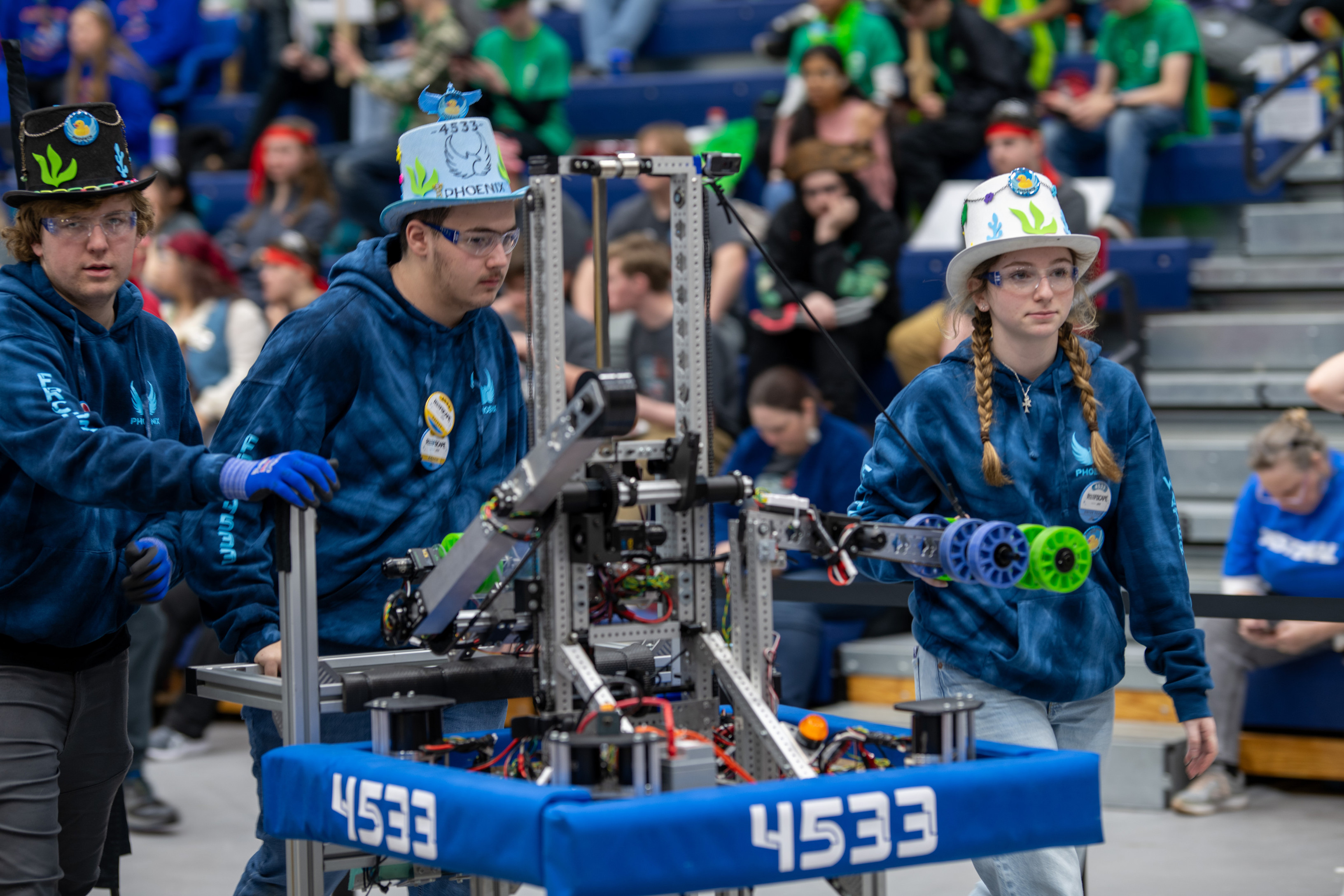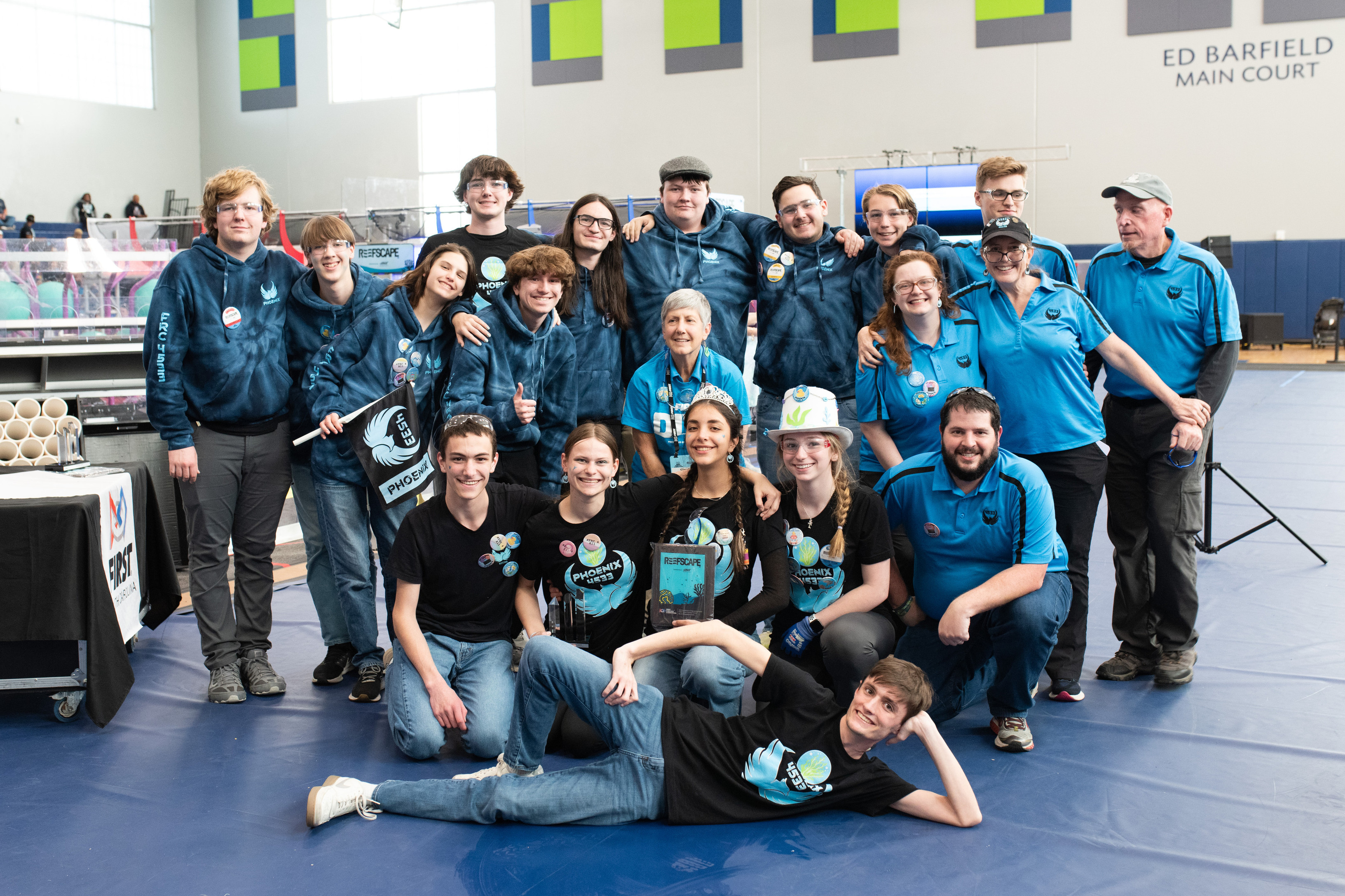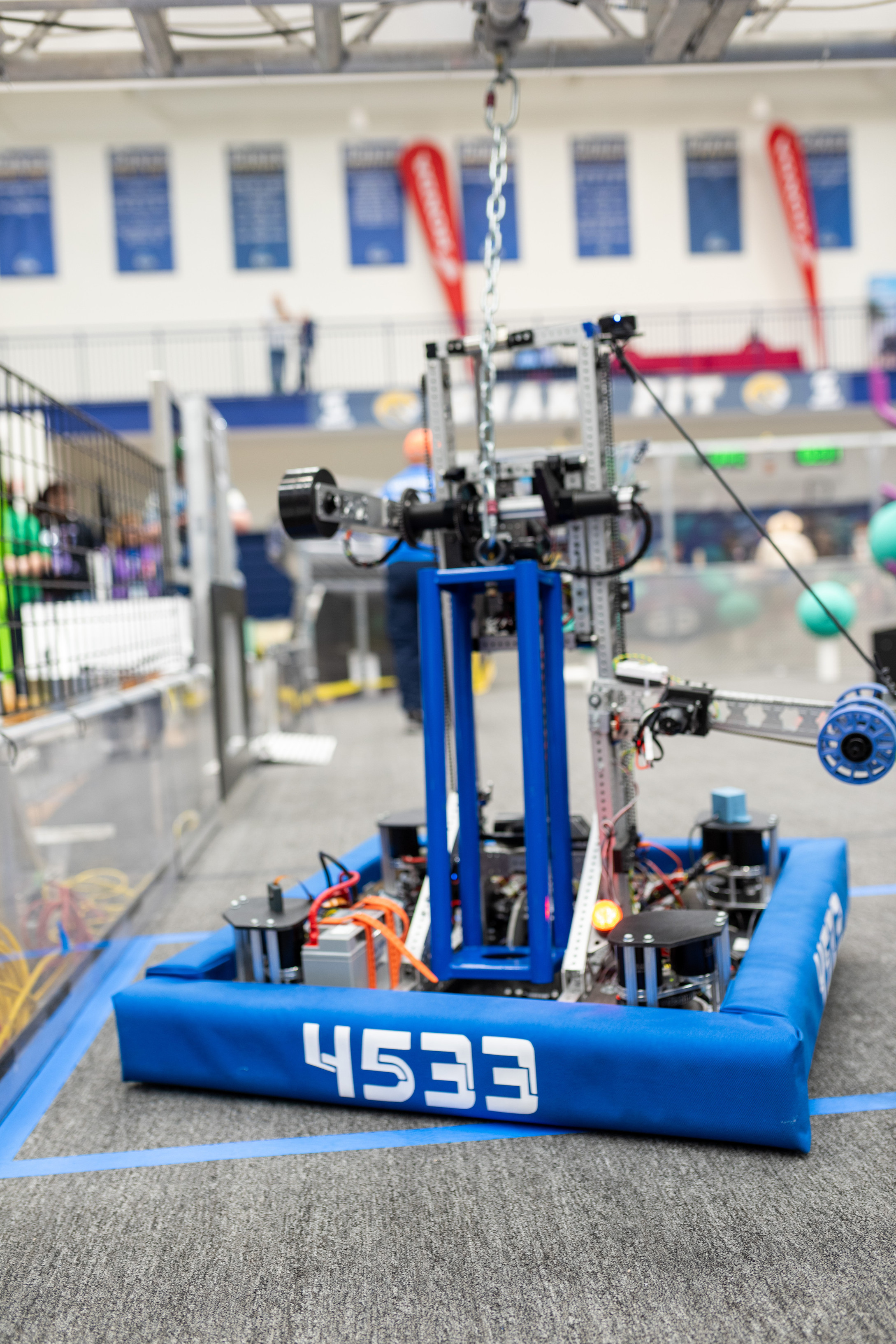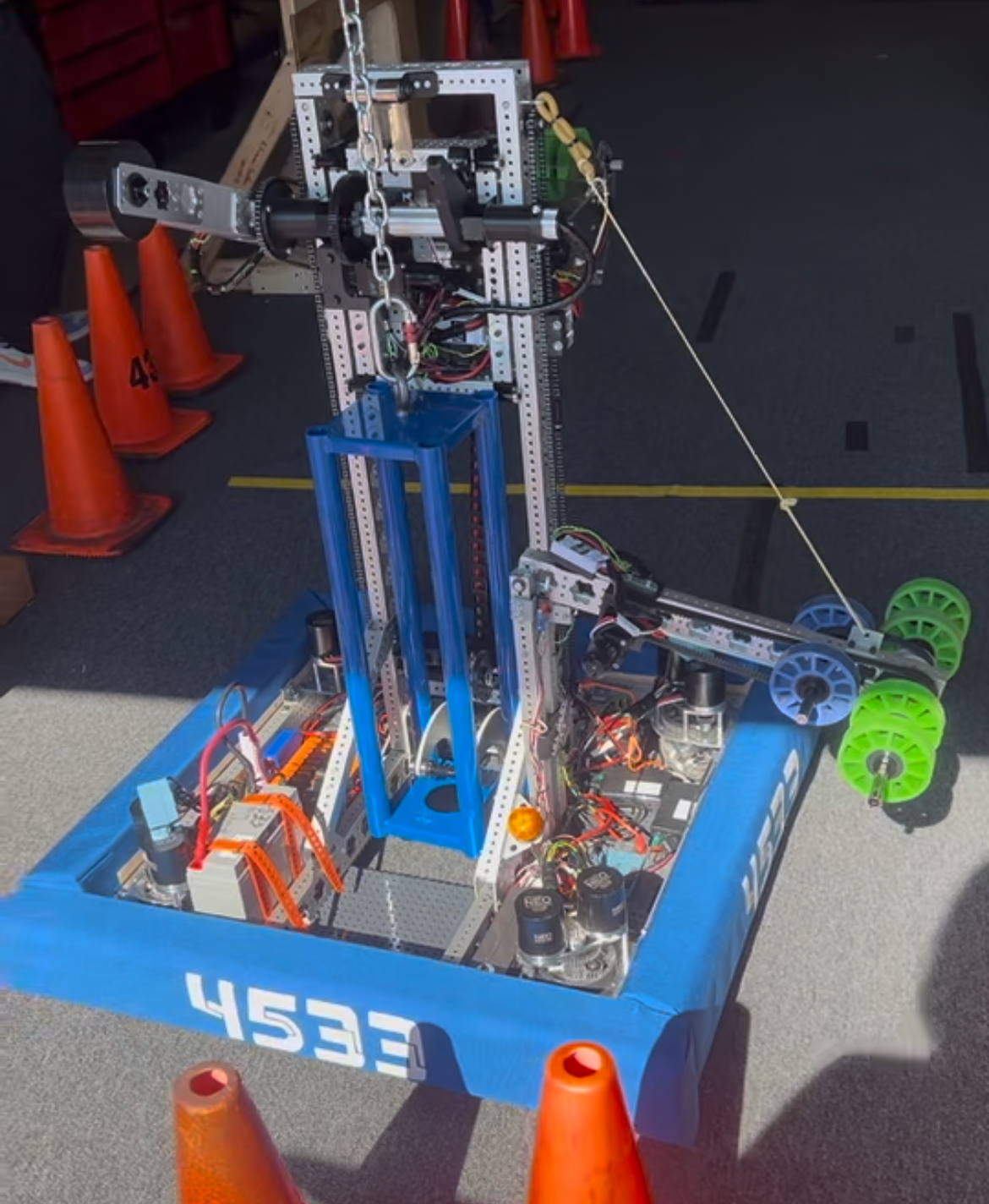 This season required us to pick up large PVC pipes (called coral) and large green playground balls (called algea). We had to place the coral onto the reef in the middle of the field on one of the 4 levels. The higher the level the more points it was worth. To score, we also had to remove algea from the reef to put coral onto it. We could optionally score algea in the processor for a co-op point and 6 regular points. We went to Hartsville and North Charleston, getting 2nd place by 4 point. We are going to Disctrict in Anderson.